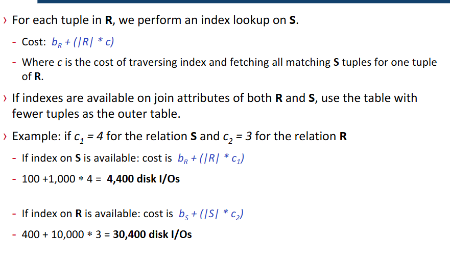 1. 对于外表 RRR 中的每条记录 rrr,使用内表 SSS 上的索引查找与 rrr 匹配的记录。